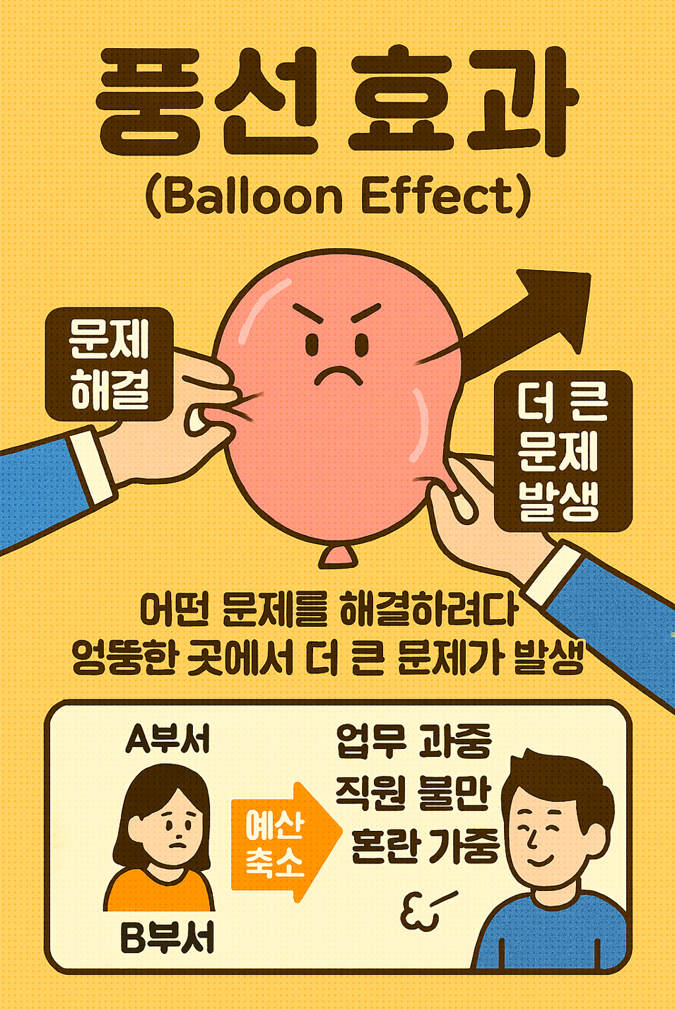 혹시 이런 경험 있으신가요? 회사에서 '비용 절감'이라는 목표를 세우고 A 부서의 예산을 확 줄였더니, 글쎄 B 부서의 업무 부담이 폭증하고 직원들의 불만이 터져 나온 거죠. 원래 문제(과도한 비용)를 해결하려고 했는데, 엉뚱한 곳에서 더 큰 문제(업무 마비, 사기 저하)가 튀어나왔을 때! 우리는 이걸 바로 '풍선 효과'라고 부른답니다.