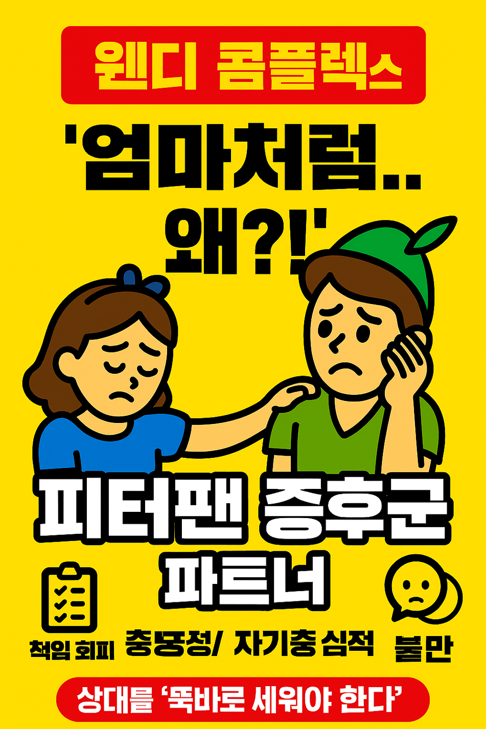 피터팬 증후군과 세트로 등장하는 용어입니다. 동화 속 '웬디'가 피터팬을 엄마처럼 돌봐주었듯, 이성(주로 여성)이 피터팬 증후군을 가진 남성(파트너)을 '엄마처럼' 챙기고 보살피려는 심리를 말합니다. 이런 관계는 서로의 미성숙함을 강화시켜 악순환을 만듭니다.