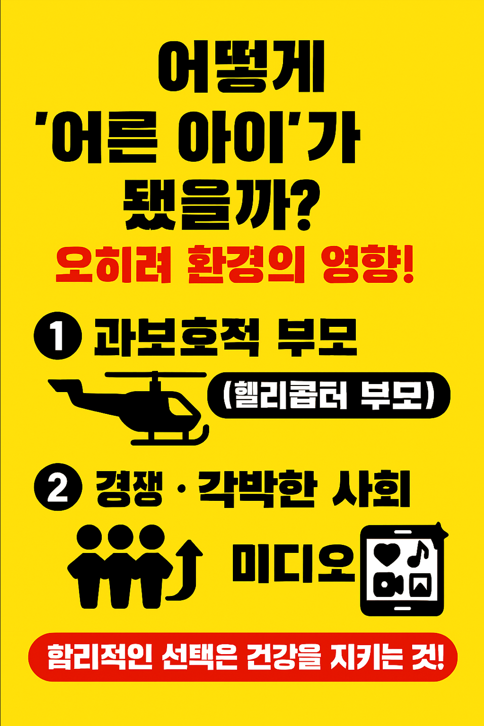 가장 큰 원인 중 하나로 꼽힙니다. 부모가 자녀의 모든 것을 대신 결정하고, 실패나 좌절을 경험할 기회조차 주지 않으면, 아이는 성인이 되어서도 스스로 문제를 해결하는 능력을 잃고 부모에게 계속 의존하게 됩니다.