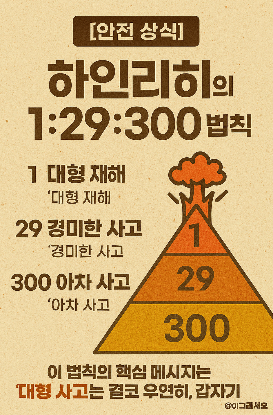 - 300 : 그 주변에는 300번의 '아차 사고(Near Misses)' (부상은 없었지만 사고가 날 뻔한 잠재적 위험 또는 징후)가 반드시 존재했다는 것입니다.