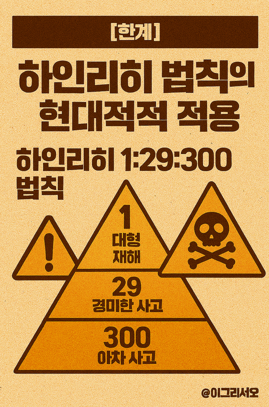 - 원인 분석의 한계: 하인리히는 사고의 주된 원인을 '인간의 불안전한 행동'으로 보았습니다. 하지만 현대 안전 이론에서는 '시스템의 구조적 결함', '안전 불감증을 조장하는 조직 문화' 등 더 복합적인 원인을 중요하게 봅니다.