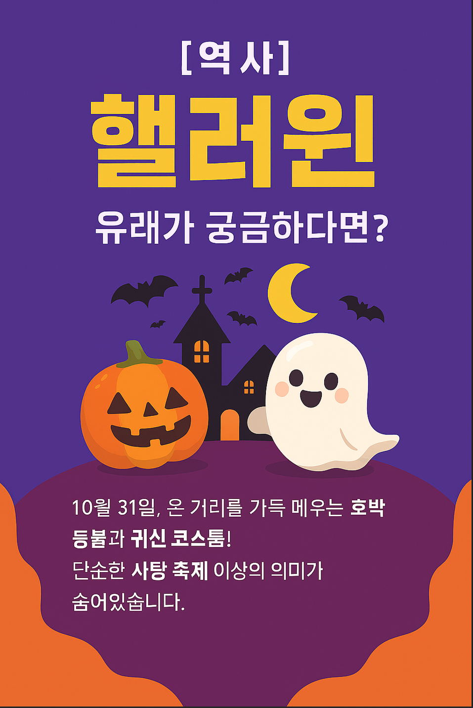 매년 10월 31일이면 온 거리가 호박 등불과 유령 코스튬으로 가득 채워지는 핼러윈(Halloween)! 신나는 축제처럼 보이지만, 사실 핼러윈의 유래는 우리가 생각하는 것보다 훨씬 오래되고 깊은 의미를 담고 있다는 사실, 알고 계셨나요?