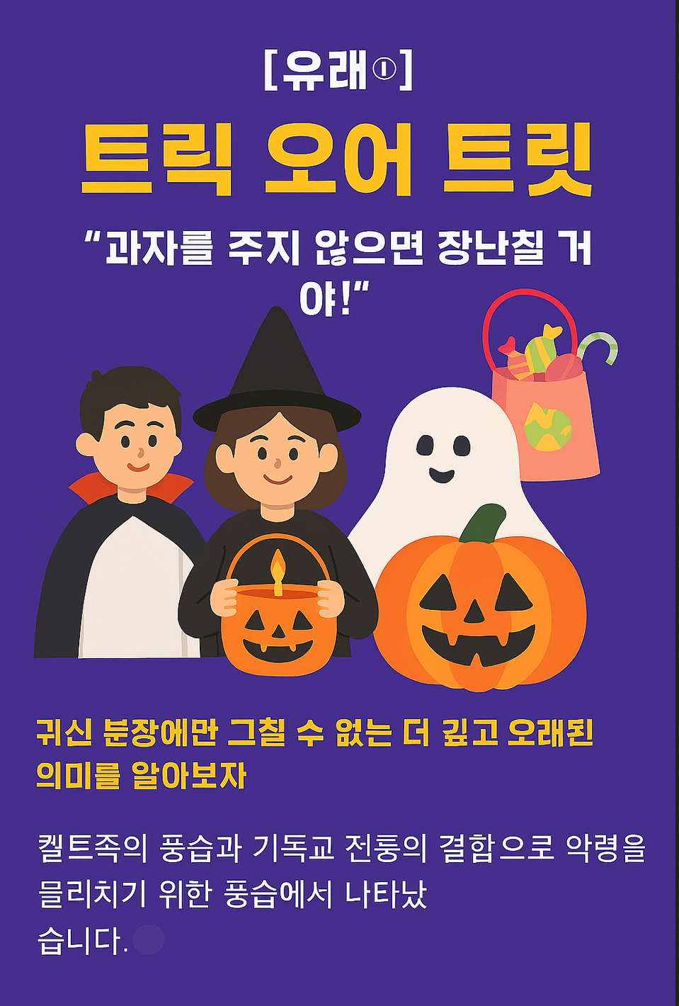 핼러윈이 단순한 하루짜리 파티가 아니라, 수천 년의 역사가 녹아있는 고대 문화의 잔재라는 사실, 흥미로우셨나요? 다음 핼러윈에는 코스튬을 입고 사탕을 받을 때마다, 고대 켈트족이 악령을 피하려 했던 간절한 마음을 한 번쯤 떠올려보세요! 더 궁금한 점이 있다면 댓글로 물어봐주세요~