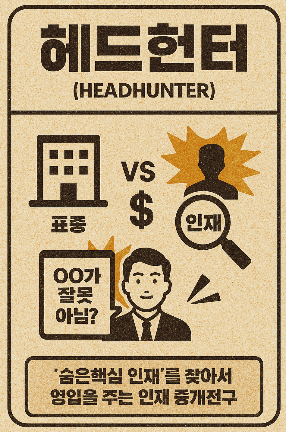 - 헤드헌터: '회사 외부'의 전문 업체(서치펌) 소속입니다. 기업의 의뢰를 받아 주로 이직 생각이 없던 '숨은 인재(Passive Talent)'를 찾아 제안합니다.