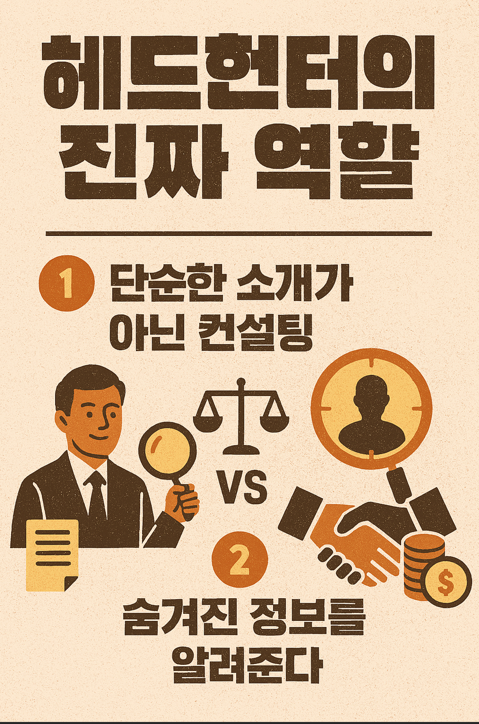 제가 처음 헤드헌터에게 연락받았을 땐, 그냥 '새로운 회사 소개해 주는 사람' 정도로만 생각했습니다. 하지만 실제 이직 프로세스를 함께 겪어보니, 그들의 역할은 훨씬 더 전문적이었습니다. (물론, 실력 없는 헤드헌터도 있습니다! 아래에서 설명할게요.)