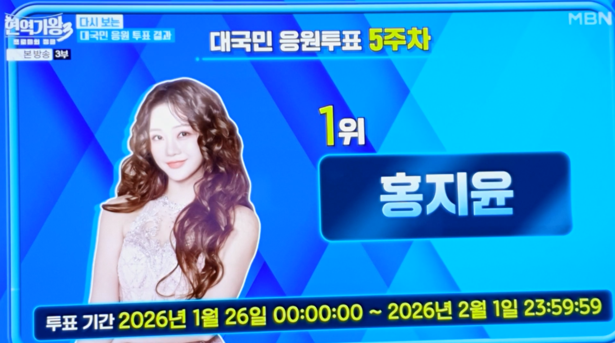 '현역가왕3'를 뜨겁게 달구고 있는 가수 홍지윤 님이 대국민 응원 투표에서 심상치 않은 기록을 세웠다는 소식입니다. 지난 2026년 2월 3일 방송된 MBN '현역가왕3'에서는 본선 3차전이 시작되기에 앞서, 시청자들의 뜨거운 관심이 집중된 대국민 응원 투표 5주 차 결과가 공개되었는데요. 여기서 홍지윤 님은 지난 4주 차에 이어 또다시 1위 자리를 굳건히 지켜냈습니다.