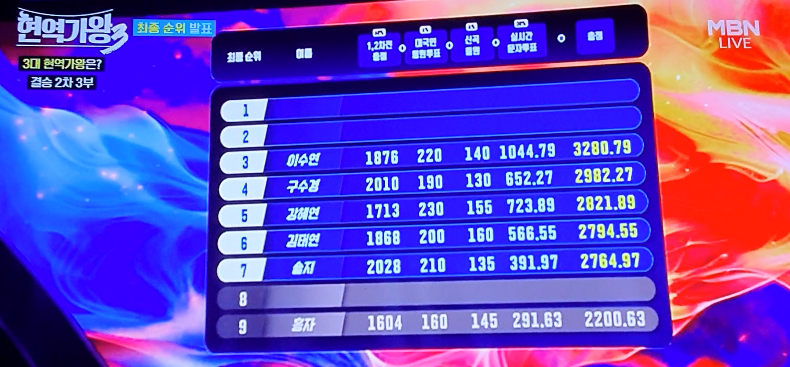솔지 씨는 2026년 3월 10일 진행된 결승 2차전 마스터 평가에서 평균 94.9점이라는 매우 높은 점수를 획득하며 전문가들의 압도적인 지지를 받았습니다. 하지만 생방송 실시간 문자 투표에서는 5만여 표에 미치지 못하는 8위를 기록하며 순위 방어에 다소 어려움을 겪는 듯 보였습니다. 그 순간 많은 팬들이 마음을 졸였을 것입니다.