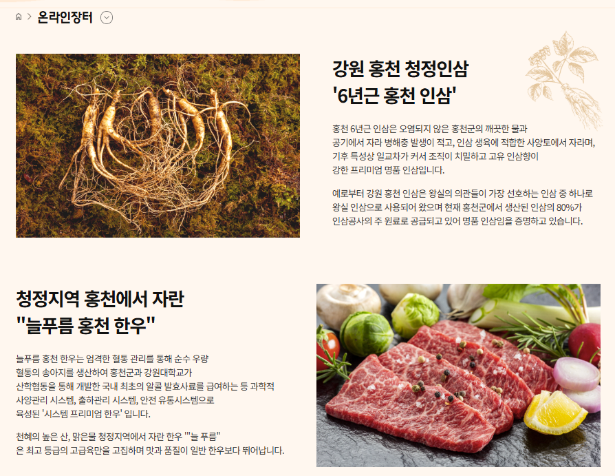 - 주요 품목: 홍천 6년근 인삼, 홍천 늘푸름 한우 등 지역 특산물