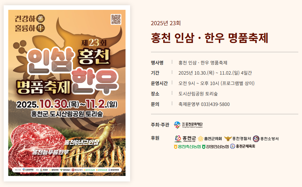 안녕하세요! 완연한 가을, 맛있는 음식과 즐거운 축제가 그리워지는 계절인데요. 바로 이번 주 목요일! 건강과 맛의 고장 홍천에서 아주 특별한 축제가 드디어 시작됩니다. 바로 제23회 홍천 인삼한우 명품축제입니다!