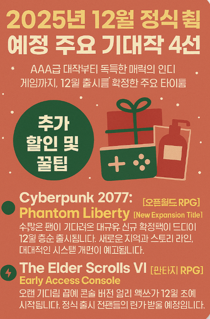 이 포스팅에서는 2025년 12월 출시가 확정된 주요 대작과, 미리 플레이해 볼 수 있는 오픈 베타 게임 정보를 상세히 정리해 드립니다. 연말을 게임과 함께 불태울 준비되셨나요?