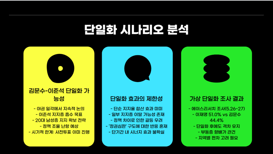 두 후보가 합쳐져도 이재명을 이기기는 쉽지 않다는 분석이 지배적이다. 단일화해도 일부 지지층 이탈 가능성은 여전하며, 정책보다는 ‘정권심판’ 구도에 대한 유권자 반응이 갈리는 상황이다.
