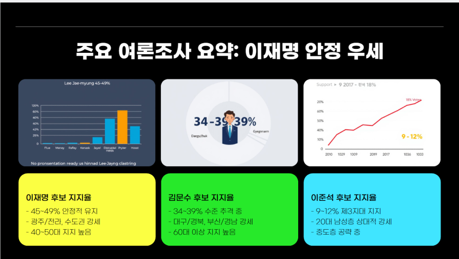 최근 발표된 주요 여론조사들을 종합해 보면 이재명 후보가 전체적으로 45~49%의 지지율을 안정적으로 유지하고 있는 것이 눈에 띈다.