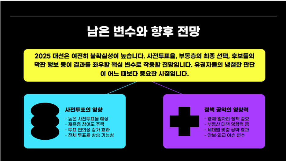 현 시점에서 이재명 후보가 확실한 선두를 유지하고 있지만, 선거란 끝까지 뚜껑을 열어봐야 안다. 사전투표율, 부동층의 마지막 선택, 정책 공약에 따른 태도 변화 등이 남은 변수다.