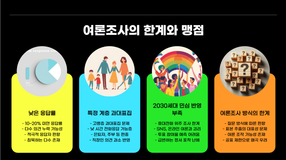 여론조사가 선거 결과를 예측하는 중요한 지표임은 분명하지만, 그 한계도 분명하다. 대부분의 전화면접 조사는 응답률이 10~20% 미만으로, 다수 유권자의 의견이 반영되지 않는다.