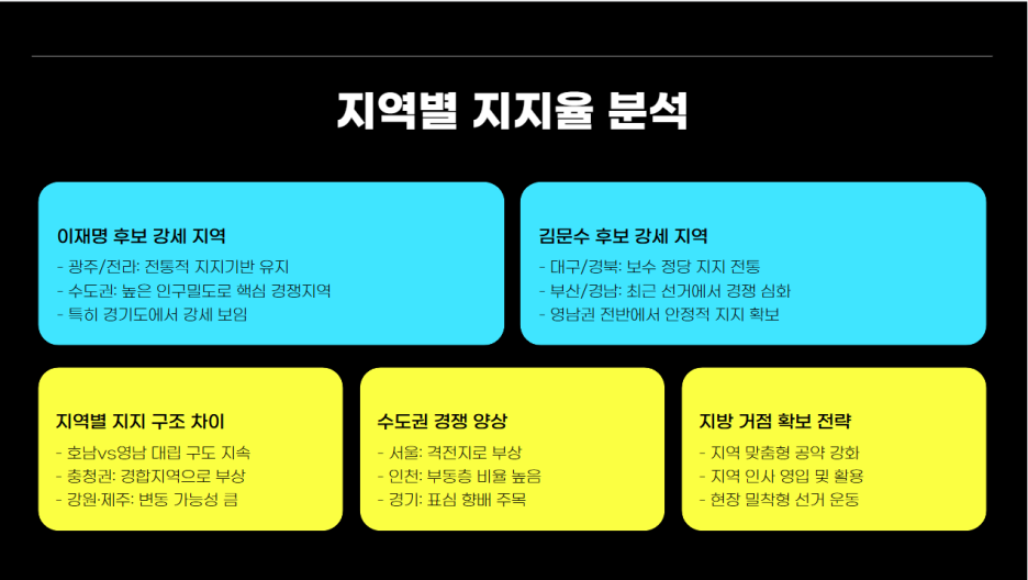 지지율 격차는 지역과 연령에서 뚜렷한 양상을 보인다. 이재명 후보는 광주/전라, 수도권에서 강세를 보이고, 김문수 후보는 대구/경북, 부산/경남에서 높은 지지를 받는 구조다.