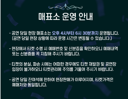 성공적인 관람을 위해 모든 도시에서 공통으로 적용되는 유의사항을 체크하세요. 12월, 1월 공연이므로 방한 준비가 특히 중요합니다.
