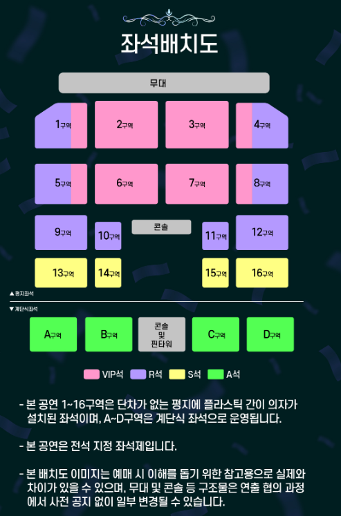VIP석 앞열은 경쟁이 매우 치열합니다. R석 구역의 통로 좌석이나, 전체 좌석 중 5~8열 정도가 무대와의 거리감, 시야 방해 회피 면에서 가장 균형 잡힌 명당입니다. - 무대 정면 중앙 S석: