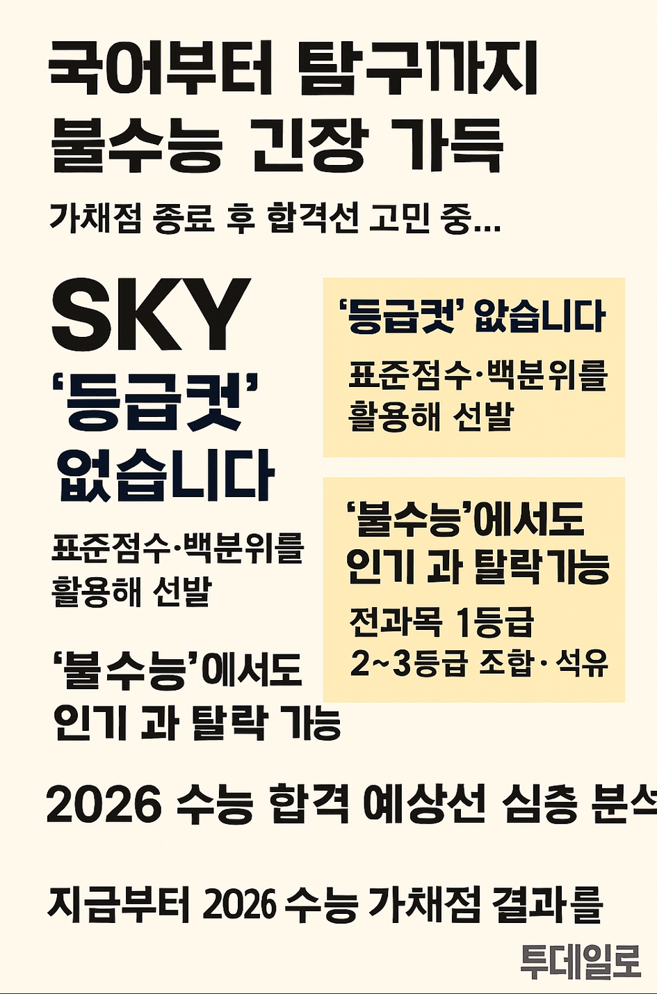 수험생 여러분, 정말 고생 많으셨습니다. 1교시 국어부터 마지막 탐구 영역까지, 단 한 순간도 긴장을 놓을 수 없는 역대급 '불수능'이었습니다. 가채점을 막 끝내고 '내 점수로 SKY를 갈 수 있을까?' 하는 불안감에 등급컷을 찾아보고 계실 텐데요.
