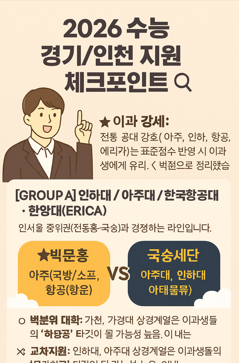 * 이과 강세: 전통 공대 강호(아주, 인하, 항공, 에리카)는 표준점수 반영 시 이과생에게 유리.