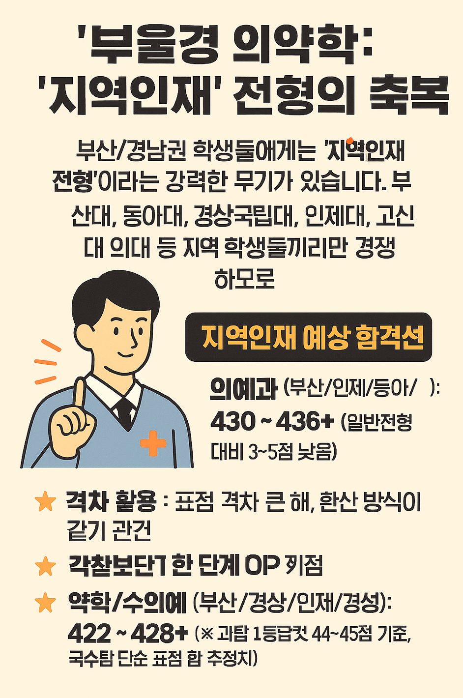 부산/경남권 학생들에게는 '지역인재 전형'이라는 강력한 무기가 있습니다. 부산대, 동아대, 경상국립대, 인제대, 고신대 의대 등은 지역 학생들끼리만 경쟁하므로 수도권 의대보다 합격선이 낮습니다.
