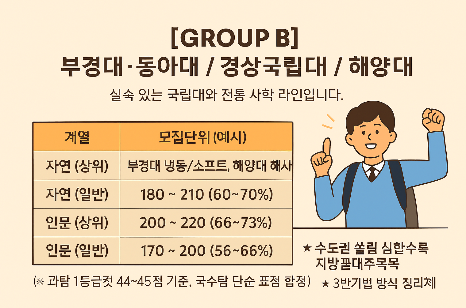 부산대는 수학과 탐구 반영 비율이 높습니다. 국어를 조금 망쳤더라도(3등급), 수학(미적)과 과탐 표점이 높다면 과감하게 상위권 공대나 경영학과에 도전해볼 만합니다.