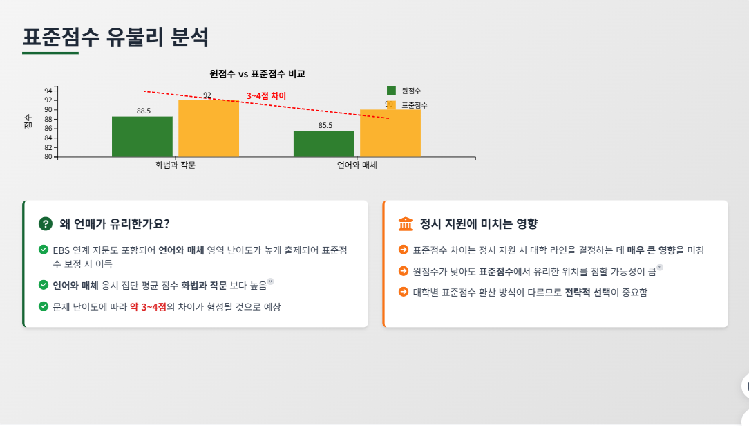 가채점 결과에 일희일비하기보다는, 본인의 표준점수가 대략 어느 위치일지 냉정하게 판단하고 남은 수시 일정이나 정시 전략을 세우는 것이 중요합니다. 특히 '언매'를 선택한 학생들은 원점수가 다소 낮더라도 표준점수에서 만회할 가능성이 크다는 점을 꼭 기억하세요.