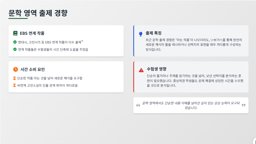 EBS 연계 지문(과학)이 하나 포함되었지만, 수험생들을 가장 괴롭힌 것은 (가)와 (나)가 엮인 '법/경제' 복합 지문이었습니다. 정보량이 매우 많고, 법적 지위와 소유권의 변동 관계를 정확히 추론해야 풀 수 있는 고난도 문항(15번, 16번)이 포진해 있었습니다. - 2. 문학 (공통): "EBS 연계, 하지만 까다로운 선택지"