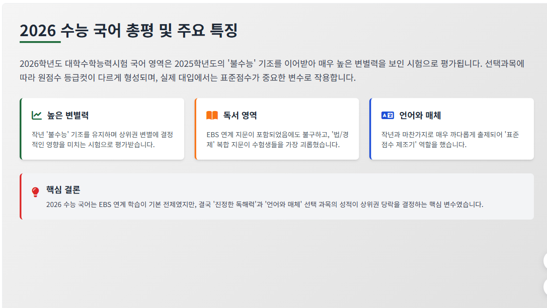 이번 2026 수능 국어는 "EBS 연계 공부는 기본, 결국 '진짜 독해력'과 '언매'가 상위권을 결정한다"는 메시지를 명확하게 던져주었습니다.