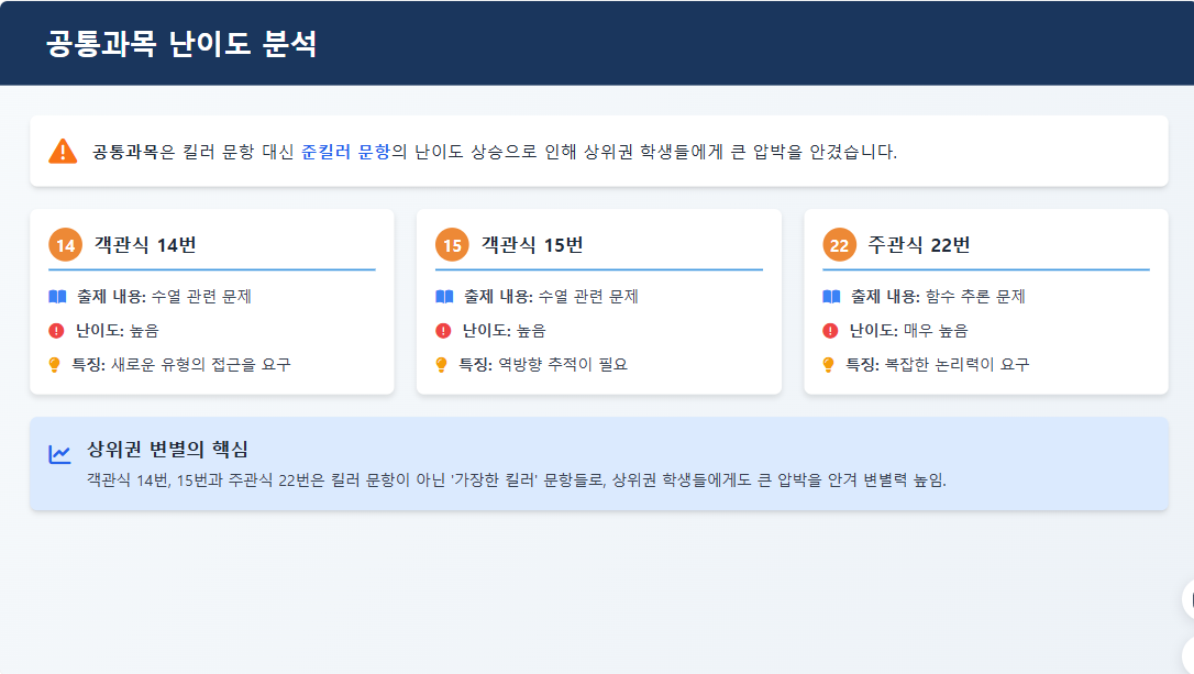 이번 수능 수학의 핵심은 '공통과목'이었습니다. 킬러 문항 배제 지침에 따라 특정 3~4문항이 극도로 어려운 대신, 전반적인 '준킬러' 문항들의 난이도를 높여 변별력을 확보했습니다.