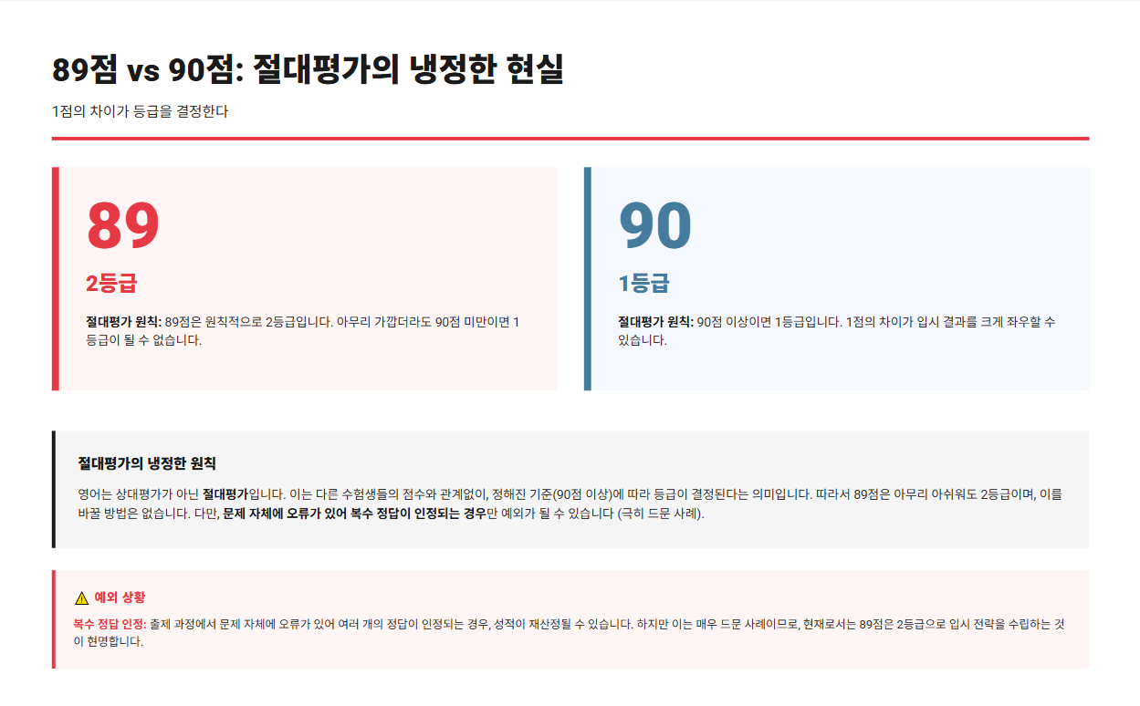 이 수치는 가채점 기반의 '예측치'입니다. 실제 성적 발표 시 1등급 비율은 소폭 변동될 수 있습니다. 특히 89점, 79점 등 '경계선'에 있는 수험생들의 실제 마킹 실수가 변수가 될 수 있습니다.