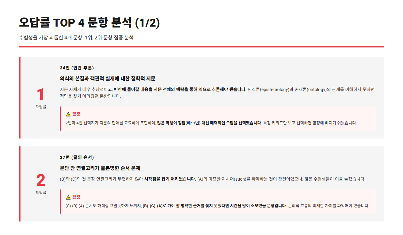 가채점 결과, 수험생들을 가장 괴롭힌 문항들은 역시 '빈칸'과 '순서/삽입' 영역에 집중되었습니다. (기관별로 오답률 순위는 다소 차이 날 수 있습니다.)