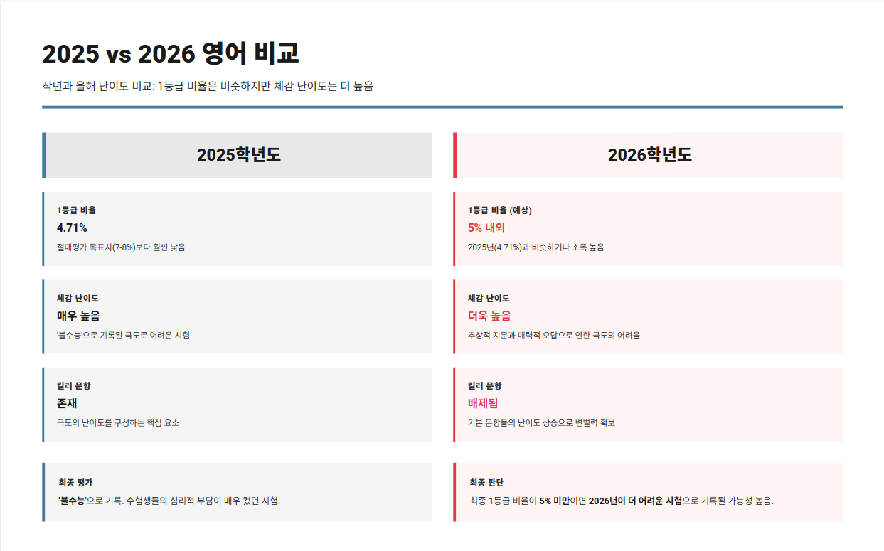 - 예상 1등급 비율 5% 내외: 2025학년도 수능(4.71%)과 비슷하거나 소폭 높은 수준의 '어려운 수능'이었습니다.