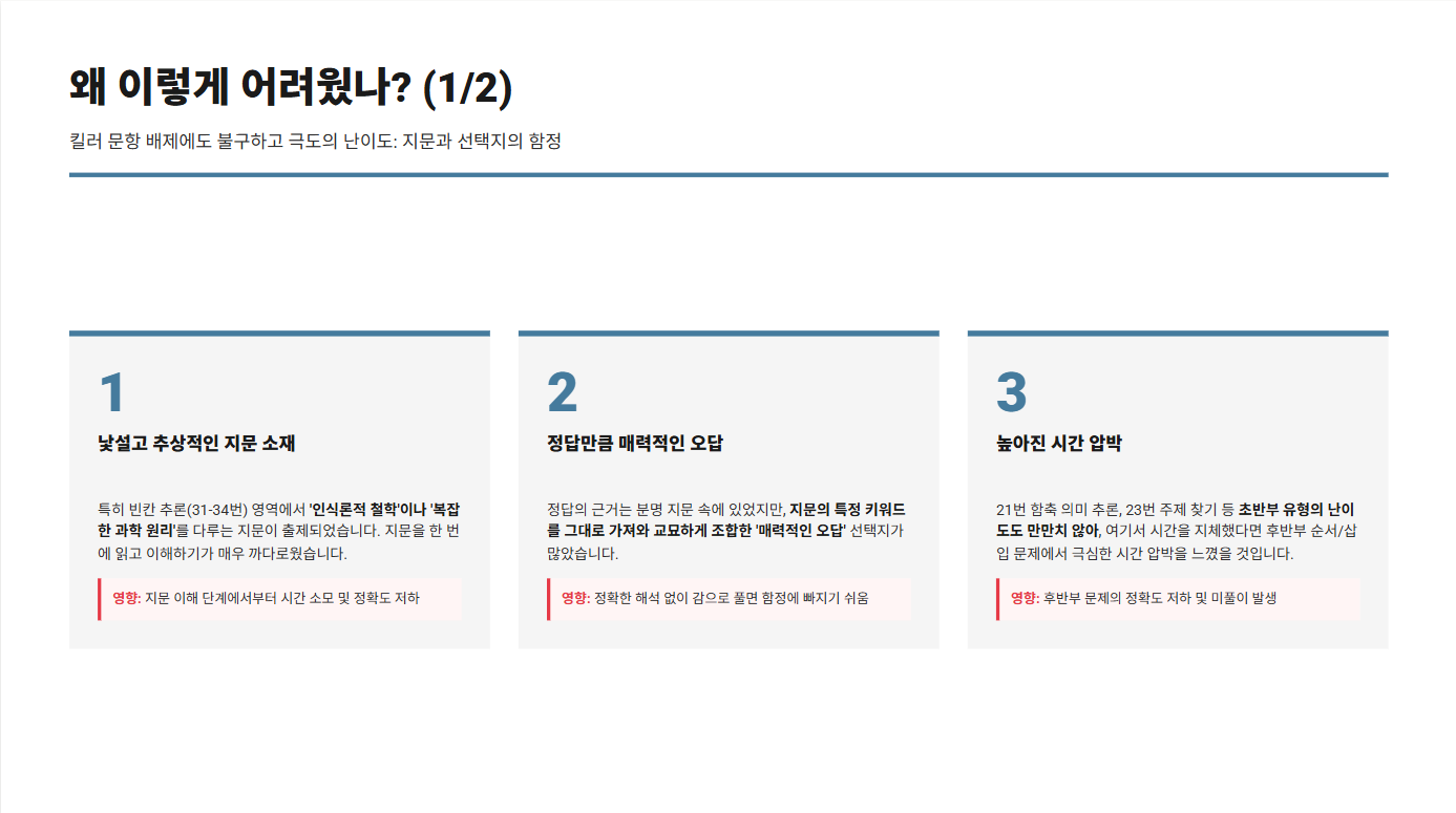 - 3. 높아진 시간 압박: 21번 함축 의미 추론, 23번 주제 찾기 등 초반부 유형의 난이도도 만만치 않아, 여기서 시간을 지체했다면 후반부 순서/삽입 문제에서 극심한 시간 압박을 느꼈을 것입니다.