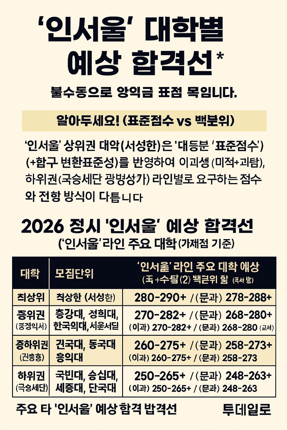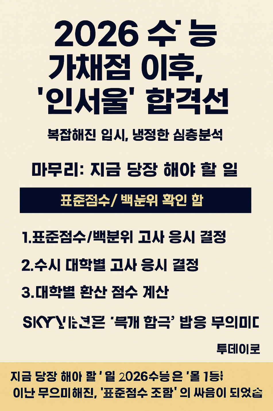 2026 수능은 '등급'이 아닌 '표준점수와 백분위'가 모든 것을 결정하는 시험입니다. '인서울'이라는 목표는 하나일지라도, 내 점수 조합에 따라 유리한 대학과 불리한 대학이 극명하게 갈립니다.