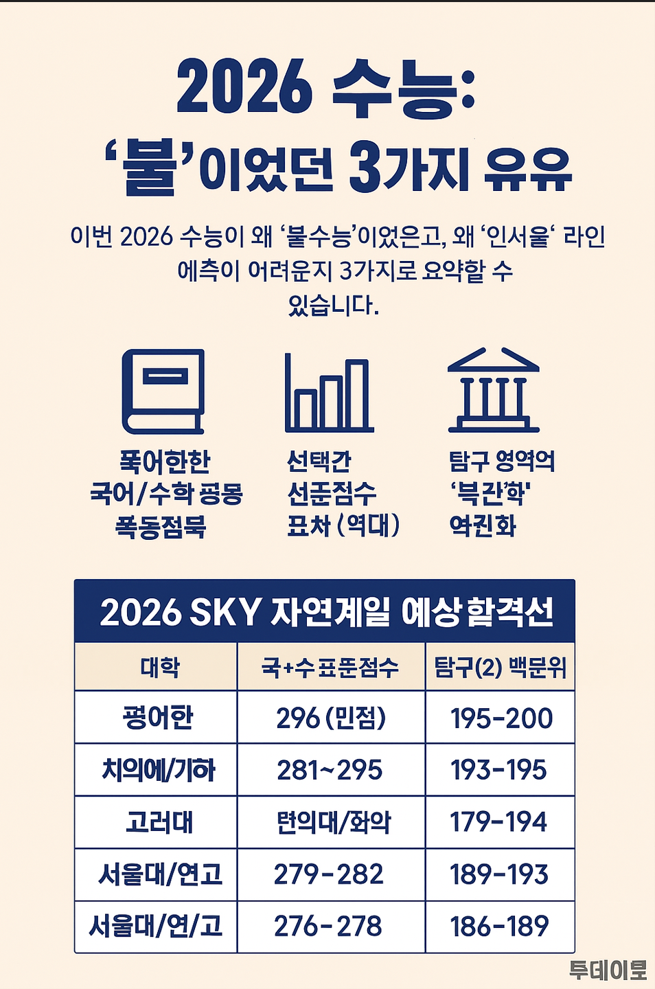 이번 2026 수능이 왜 '불수능'이었고, 왜 '인서울' 라인 예측이 어려운지 3가지로 요약할 수 있습니다.