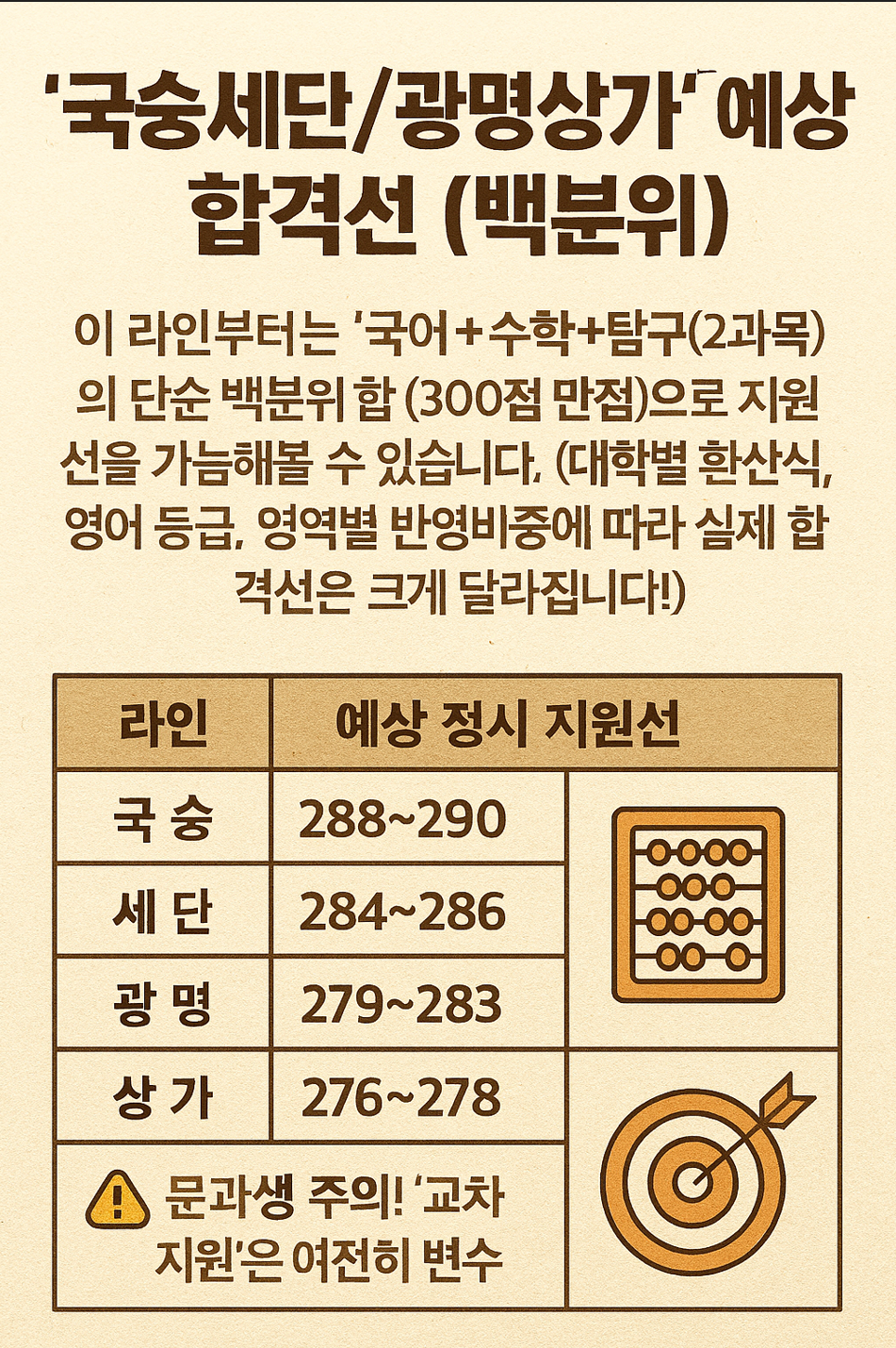 특히 '인서울 중하위권'(국숭세단, 광명상가 라인)을 목표로 하는 학생들은 더 혼란스러울 것입니다. 언론에서는 온통 '표준점수' 격차, '이과생의 문과침공' 이야기뿐인데, 내 등급은 애매하게 3~4등급에 걸쳐있기 때문이죠.