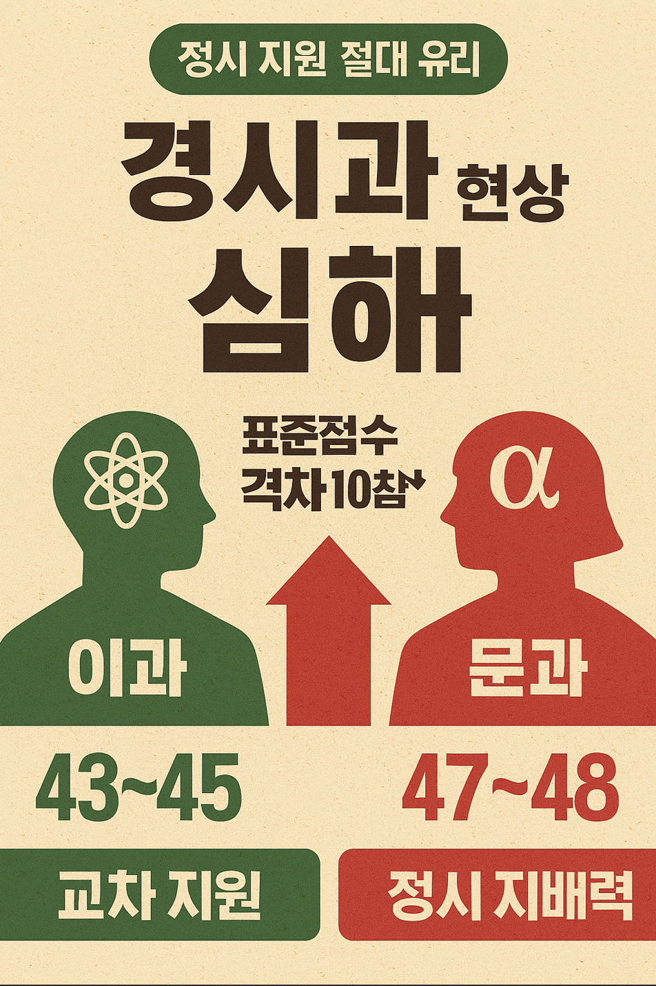 국어와 수학에서도 이과생(미적분+과탐 응시자)의 표준점수가 문과생보다 높은 상황에서, 탐구 영역마저 10점 이상의 격차가 벌어지면 사실상 정시에서 이과생의 우위가 절대적으로 굳어집니다. 특히 서울대, 연세대, 고려대 등 탐구 반영 비율이 높고 표준점수를 그대로 반영하는 대학(또는 변환표준점수 격차가 큰 대학)일수록 이과생의 문과 교차 지원(문과침공)이 더욱 용이해집니다.