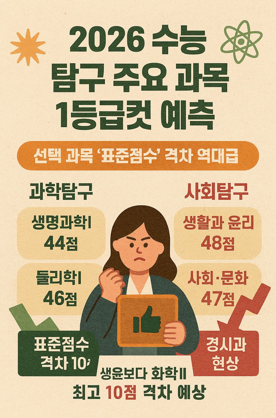 탐구 영역 '표준점수 복권', 2026 입시 최대 변수로? 2025년 11월 13일에 치러진 2026학년도 수능 탐구 영역의 예상 등급컷과 표준점수 유불리를 심층 분석합니다. '경시과(정시는 과학탐구)' 현상이