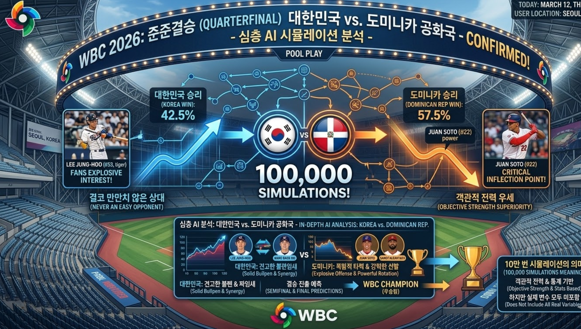 - ✅ AI 시뮬레이션 결과, 한국의 승리 확률은 42.5%. 선발 투수의 초반 호투와 후반 타선의 집중력이 중요합니다.