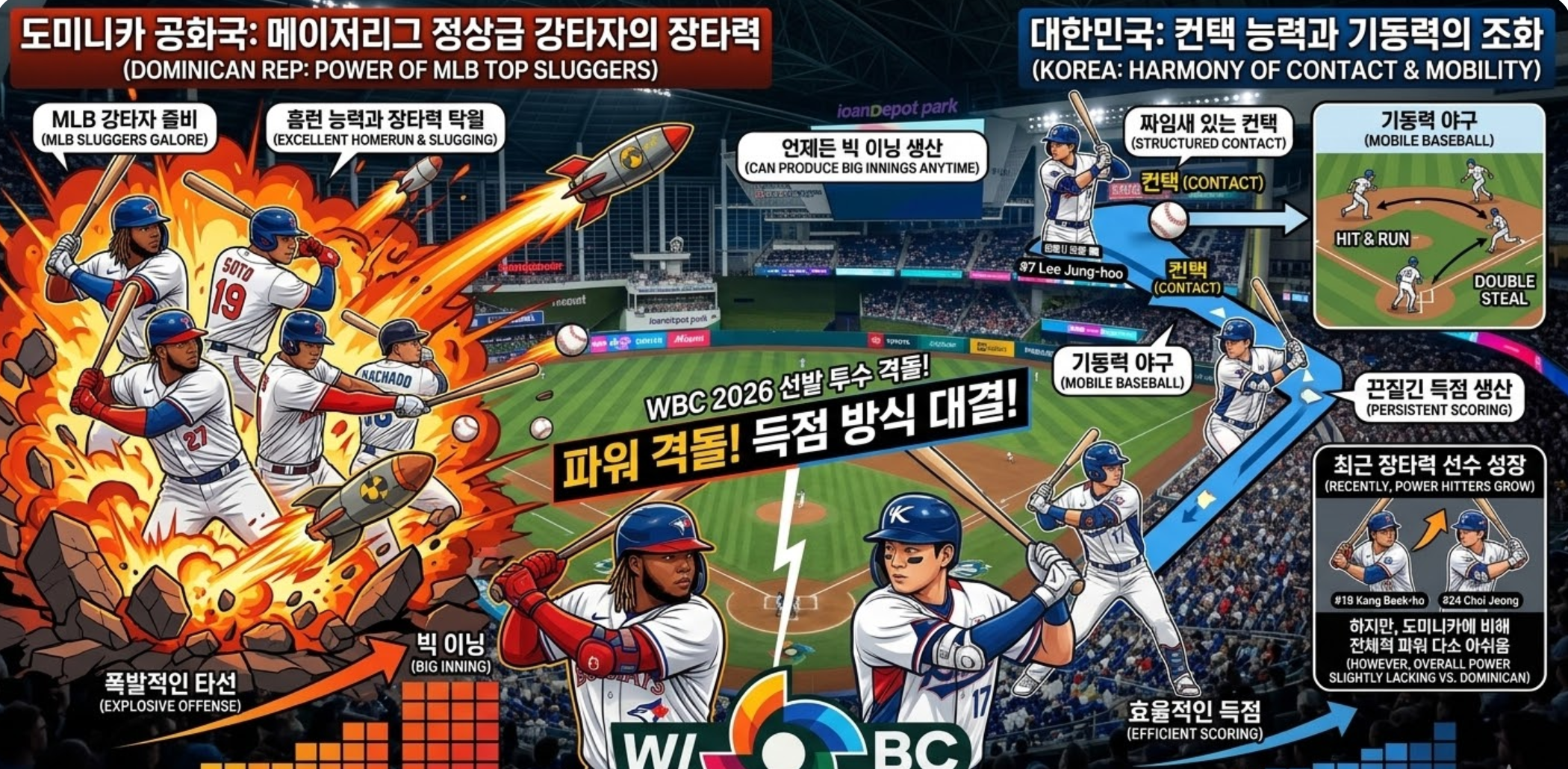 도미니카공화국은 메이저리그를 대표하는 강타자들이 즐비한 팀입니다. 홈런 능력과 장타력이 뛰어나 언제든 빅 이닝을 만들어낼 수 있는 폭발적인 타선을 자랑하죠. 반면 한국은 짜임새 있는 컨택 능력과 기동력을 바탕으로 득점을 올리는 스타일입니다. 물론 최근에는 장타력 좋은 선수들도 많이 성장했지만, 도미니카에 비하면 전체적인 파워는 다소 아쉬울 수 있습니다.
