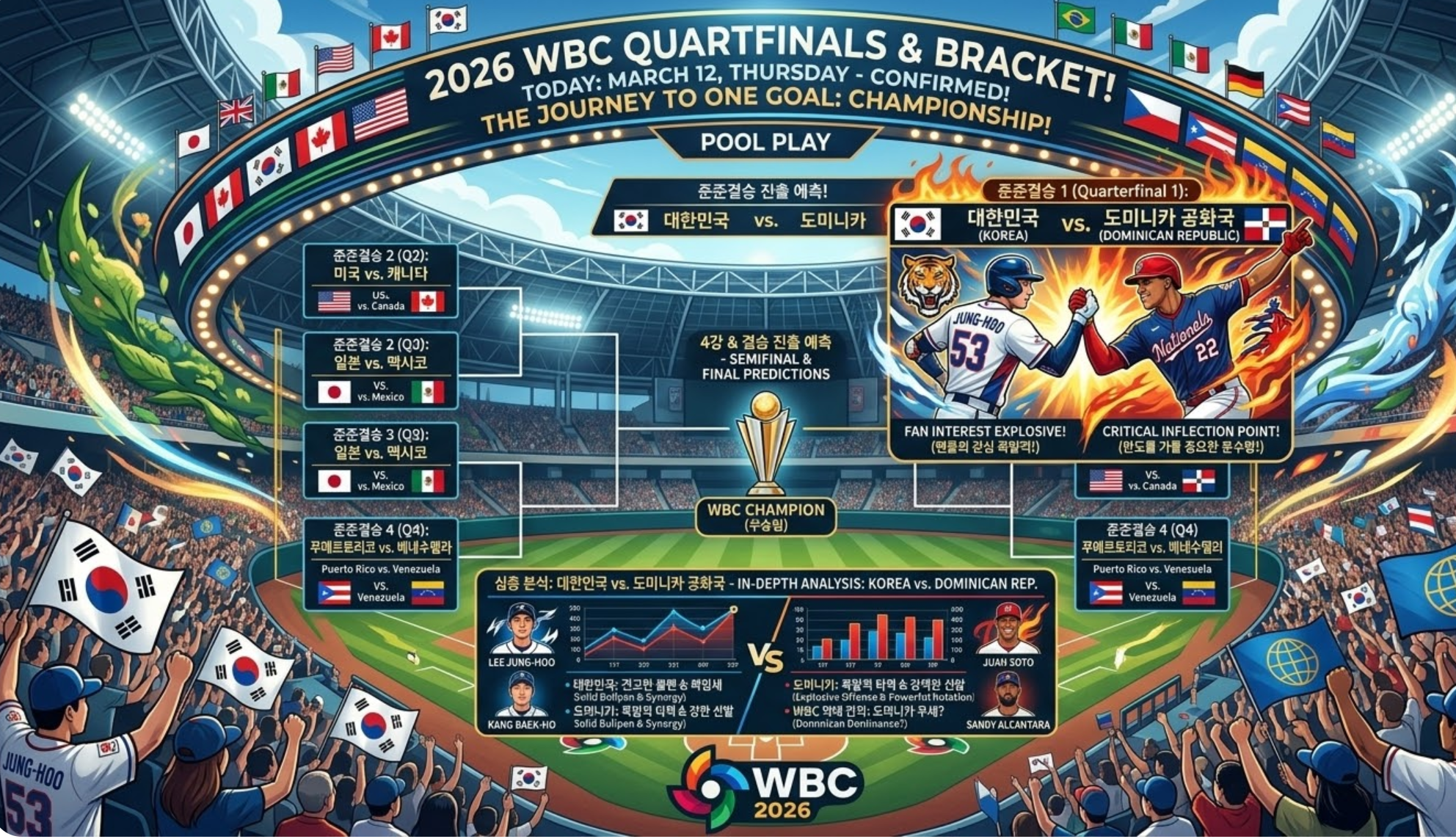 - ✅ 한국, 2026 WBC 8강에서 도미니카공화국과 격돌! 강력한 우승 후보와의 빅매치로 뜨거운 관심이 집중되고 있습니다.