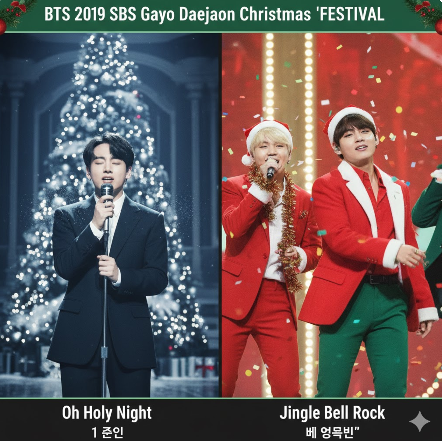BTS가 크리스마스 캐럴을 커버한 가장 대표적인 무대는 2019년 SBS 가요대전 'FESTIVAL'에서 선보인 특별 메들리입니다. 각 멤버의 개성이 돋보이는 곡 선정과 퍼포먼스가 압권이었습니다.