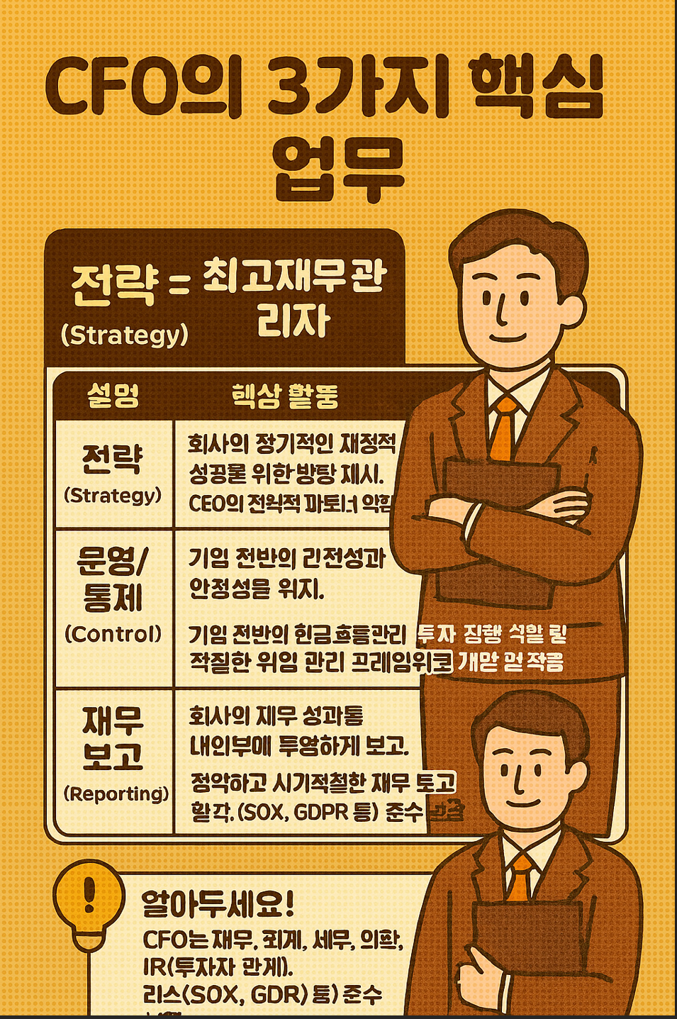 CFO는 재무, 회계, 세무, 외환, IR(투자자 관계), 리스크 매니지먼트 등 **돈에 관련된 모든 일**을 총괄하는 가장 막강한 실세 자리입니다.