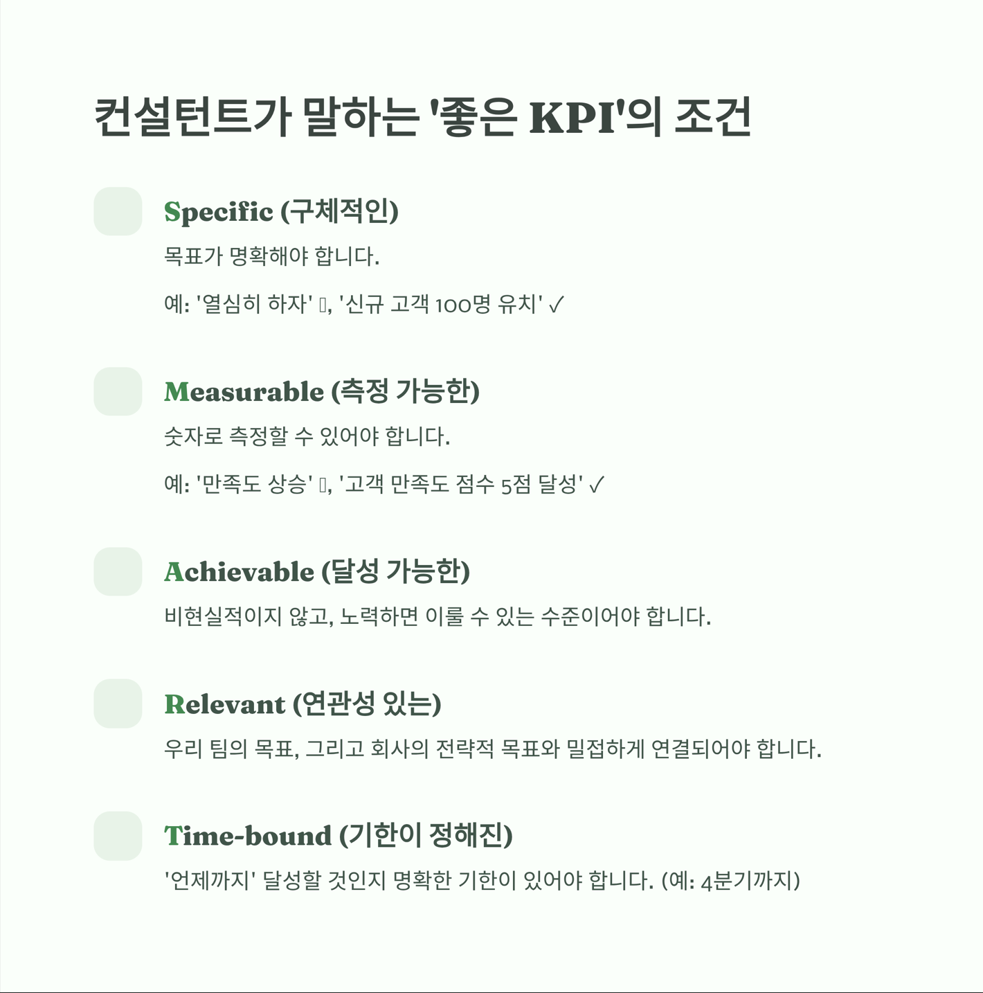 | 영업팀 | '매출액 100억 달성' (이건 최종 '결과'지표(KGI)입니다. 과정을 관리할 수 없죠.) | - 신규 고객 유치 건수 - 기존 고객 재구매율 - 영업 파이프라인 단계별 전환율 |