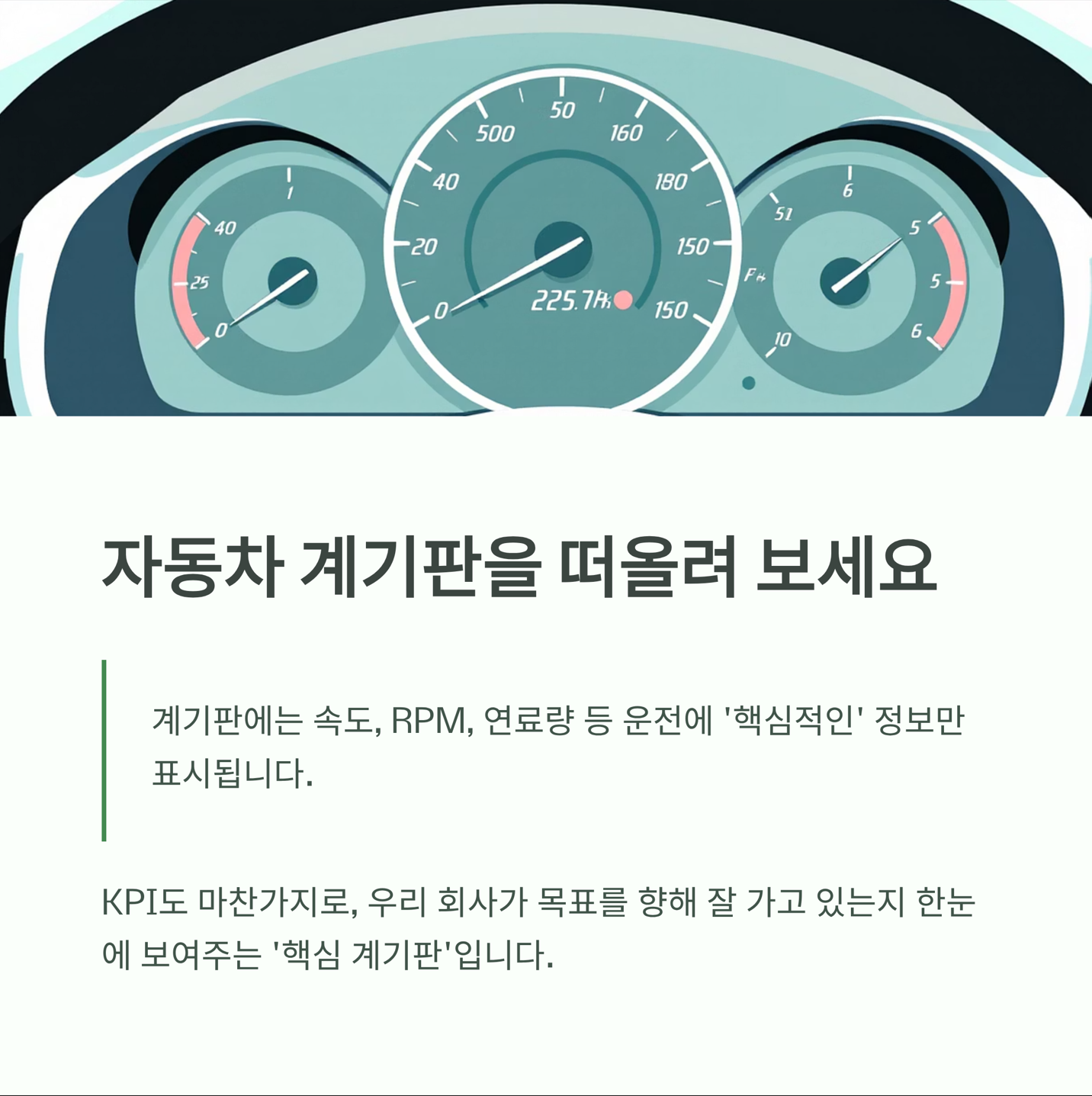 자동차 운전석의 '계기판'을 생각하시면 쉽습니다. 계기판에는 속도, RPM, 연료량 등 운전에 '핵심적인' 정보만 표시되죠? 타이어 공기압이나 엔진오일 온도 같은 모든 정보를 보여주진 않습니다. KPI도 마찬가지로, 우리 회사가 목표를 향해 잘 가고 있는지 한눈에 보여주는 '핵심 계기판'입니다.
