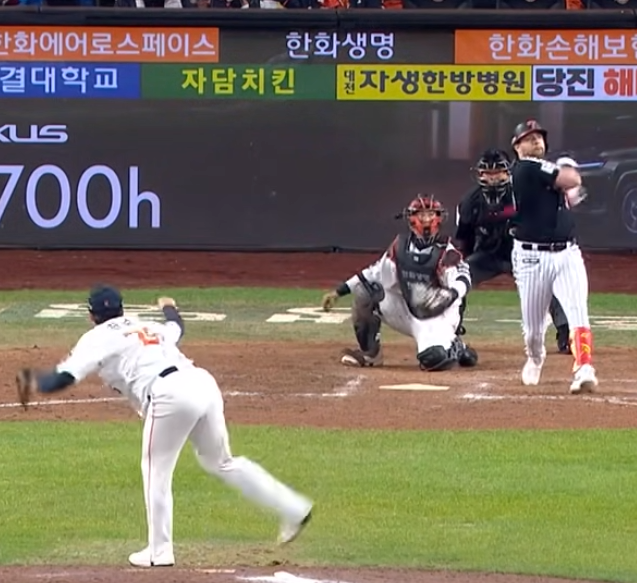 한화 벤치는 김서현을 믿었지만, 천성호 땅볼 이후 박해민에게 또다시 볼넷을 허용하자 결국 투수를 박상원으로 교체했습니다. 하지만 LG의 기세는 꺾이지 않았습니다. 홍창기가 안타로 1사 1, 2루를 만들었고, 신민재가 진루타로 2사 2, 3루의 역전 찬스를 마련했습니다.