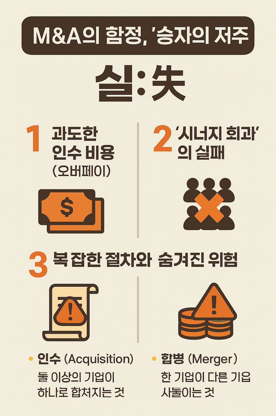 하지만 모든 M&A가 성공하는 것은 아닙니다. 장밋빛 미래만 보고 뛰어들었다가 오히려 기업 전체를 위기에 빠뜨리는 '실'이 되기도 합니다. 이를 흔히 '승자의 저주(Winner's Curse)'라고 부릅니다.