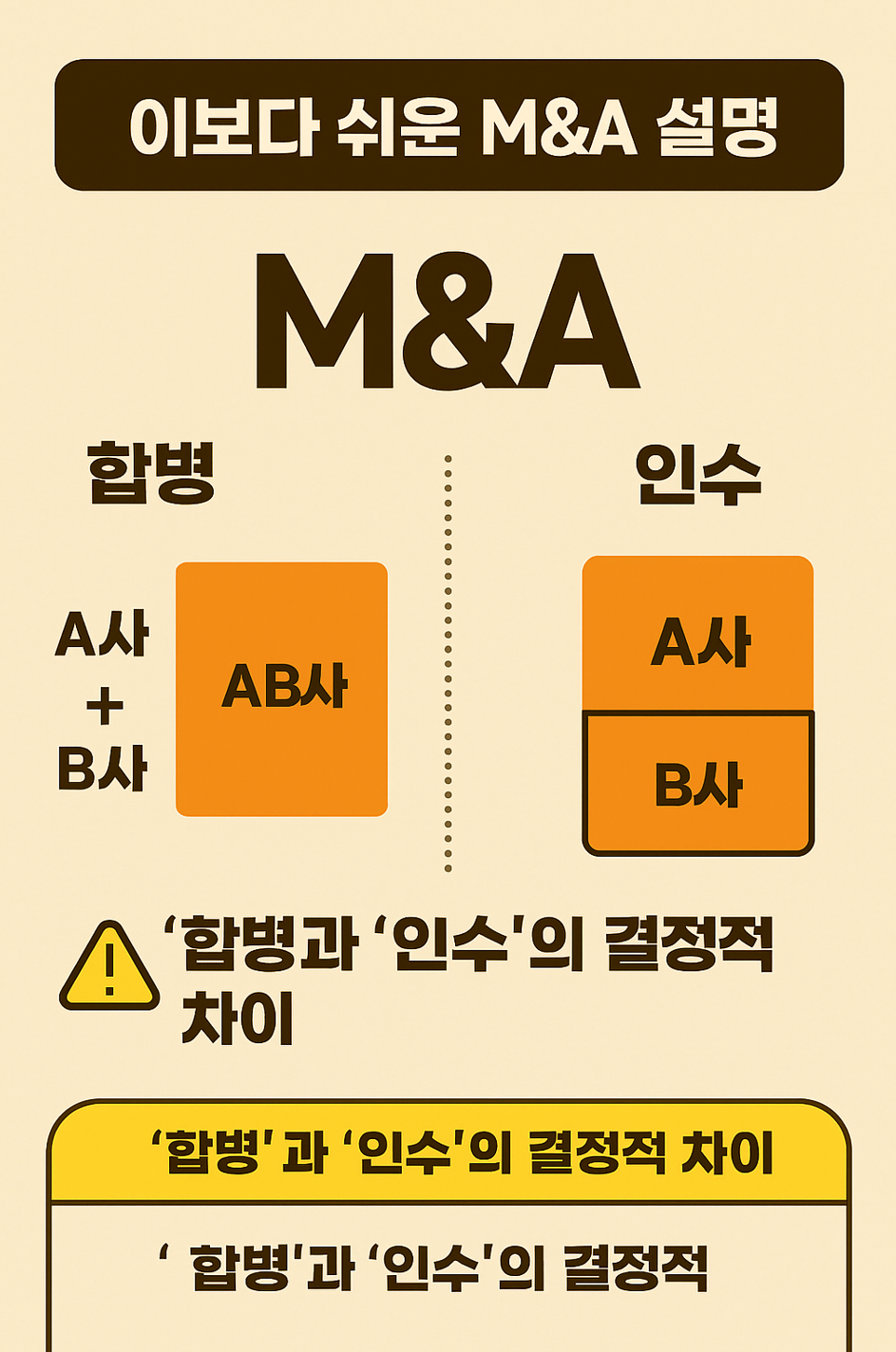 기업이 성장하거나, 새로운 기술을 얻거나, 경쟁자를 줄이는 등 다양한 목적을 달성하기 위해 다른 기업과 합치거나(합병) 경영권을 사들이는(인수) 모든 과정을 통틀어 M&A라고 부릅니다.