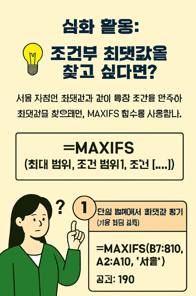 - 고급: 조건부 최댓값은 `MAXIFS` 함수 (엑셀 2019 이상)를 사용해야 합니다.