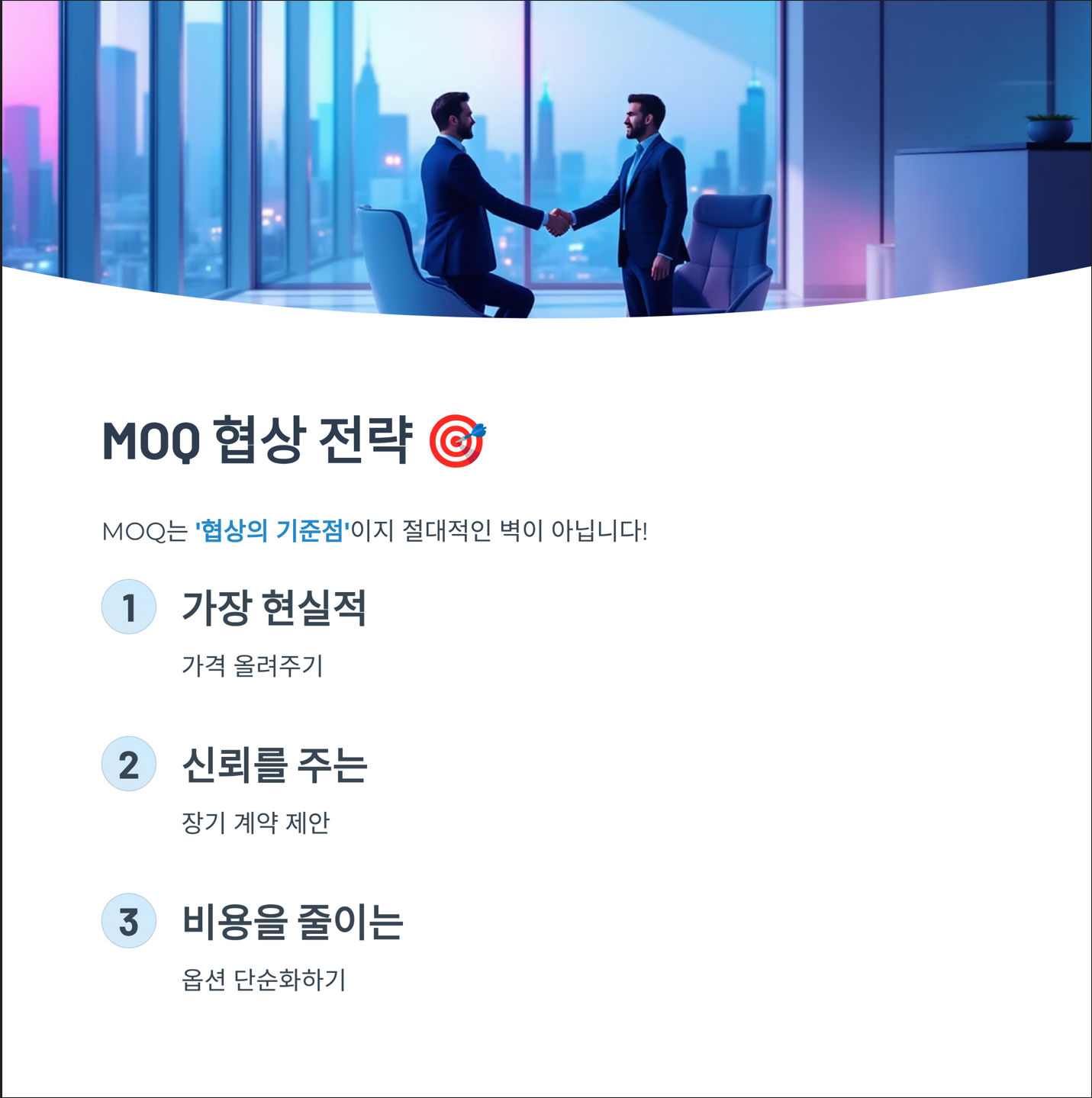 MOQ 100장을 채우기 어려운 1인 사업자나 소상공인분들은 어떻게 해야 할까요? MOQ는 '절대적인 벽'이 아니라 '협상의 기준점'입니다. 아래 3가지 방법으로 공급사와 협상(딜)을 시도해 보세요.